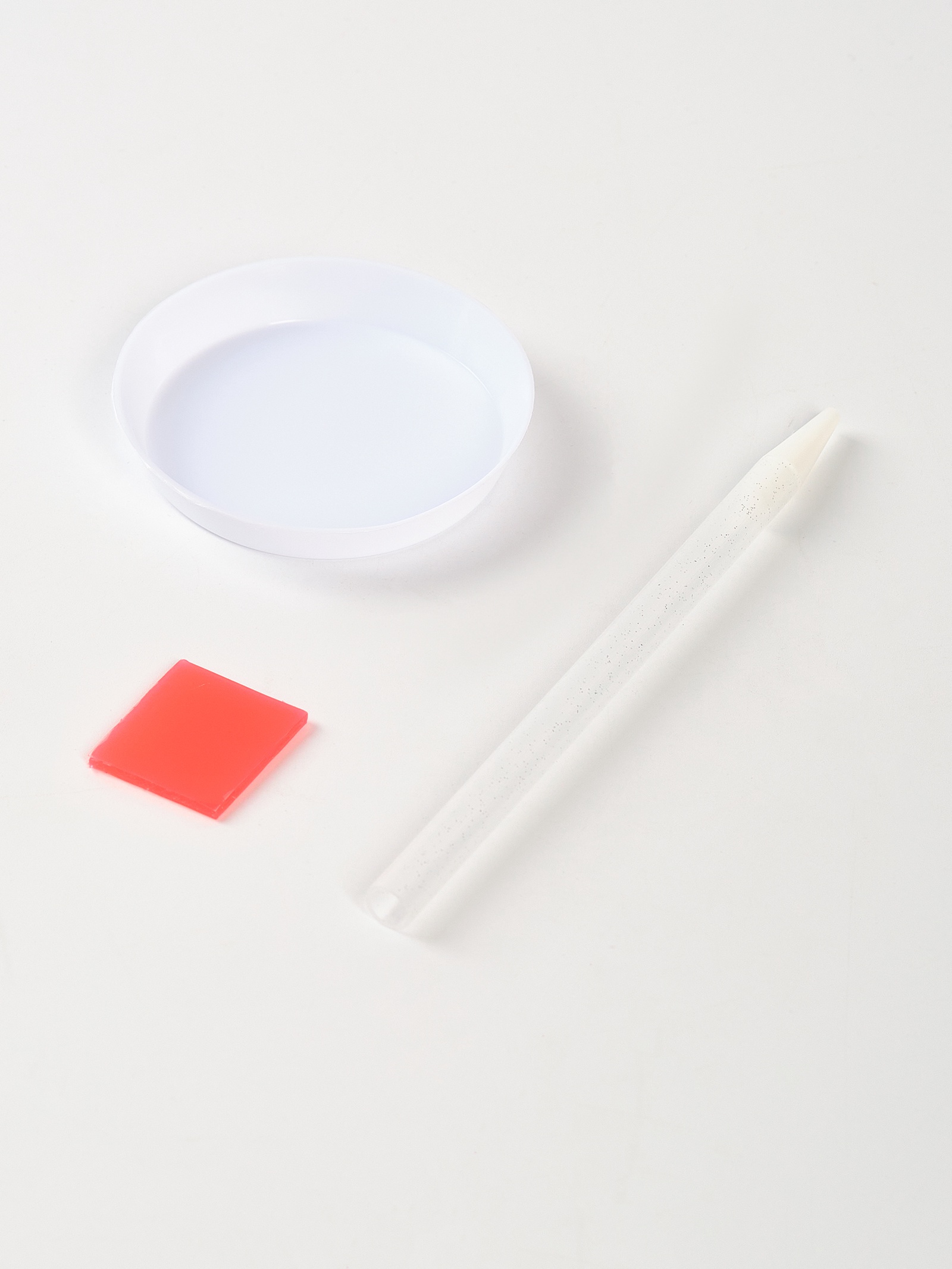 В набор входит: картонная основа (15х21 см), стразы, поддон для страз, стилус, клеевая подушечка