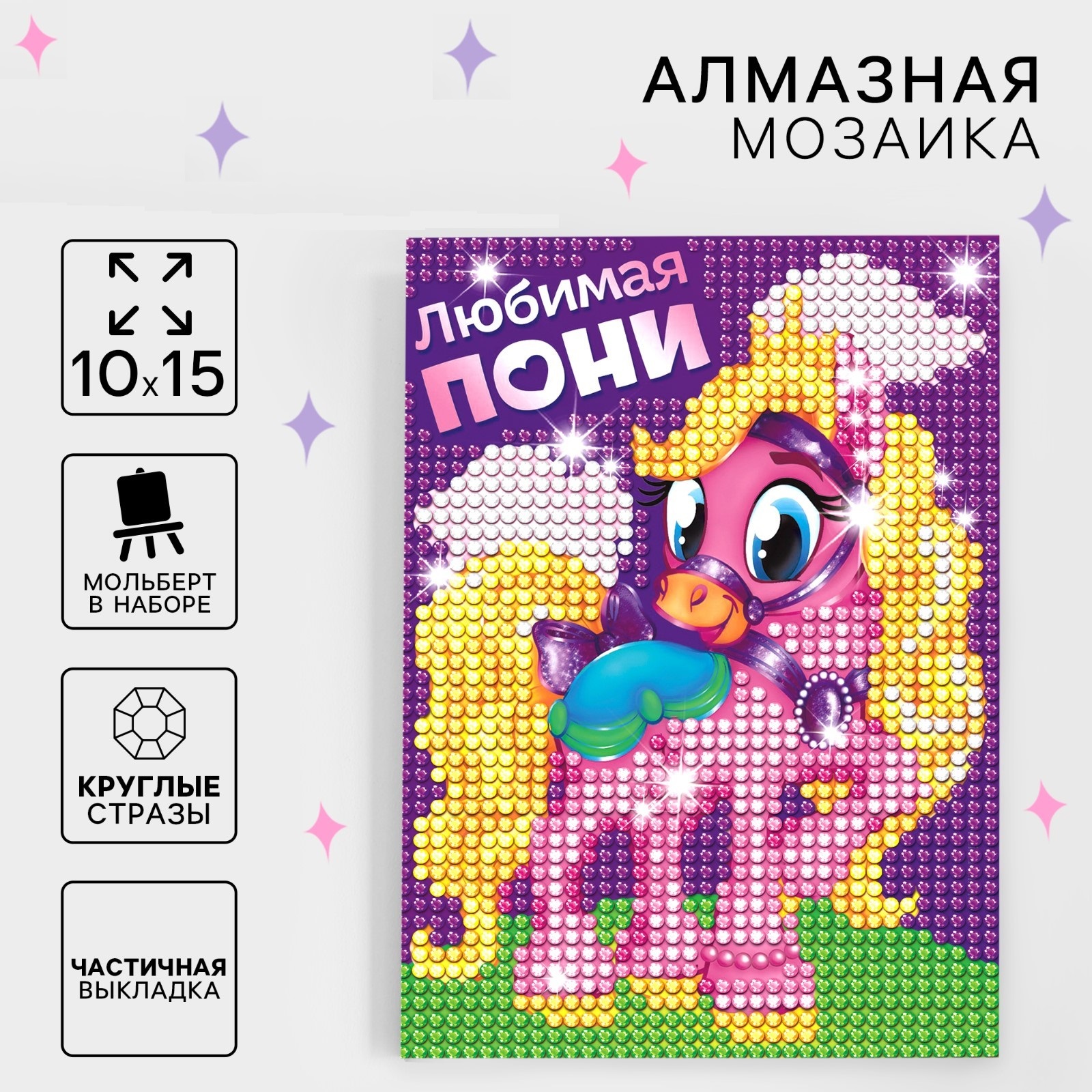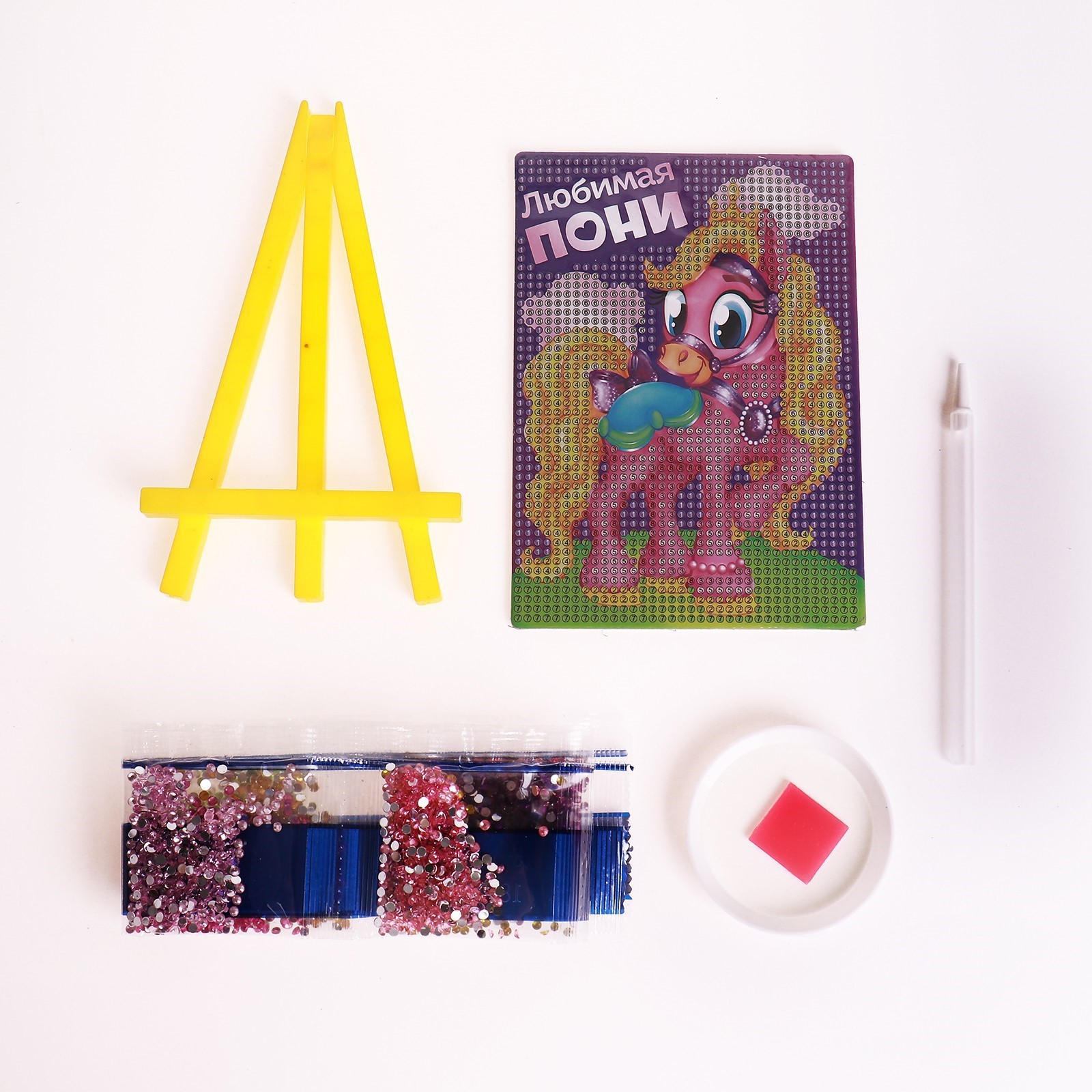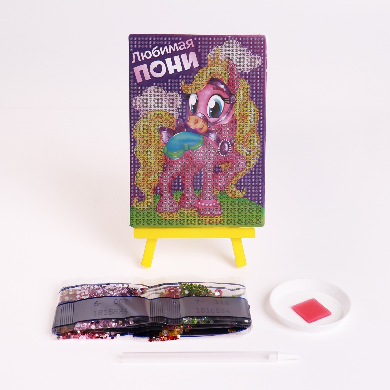 Алмазная мозаика — это увлекательный вид творчества, который понравится любому малышу! Ребёнку предстоит разложить кристаллики карандашом по пронумерованной схеме, заполнив всё полотно. Основа с клеевым покрытием будет надёжно удерживать стразы. На ней уже обозначены необходимые оттенки, а цветовая таблица расположена на упаковке. В наборе есть небольшой мольберт: с ним готовое творение можно расположить на полке или столе без дополнительных креплений. В таком интересном оформлении сверкающая картина будет выглядеть как предмет искусства.