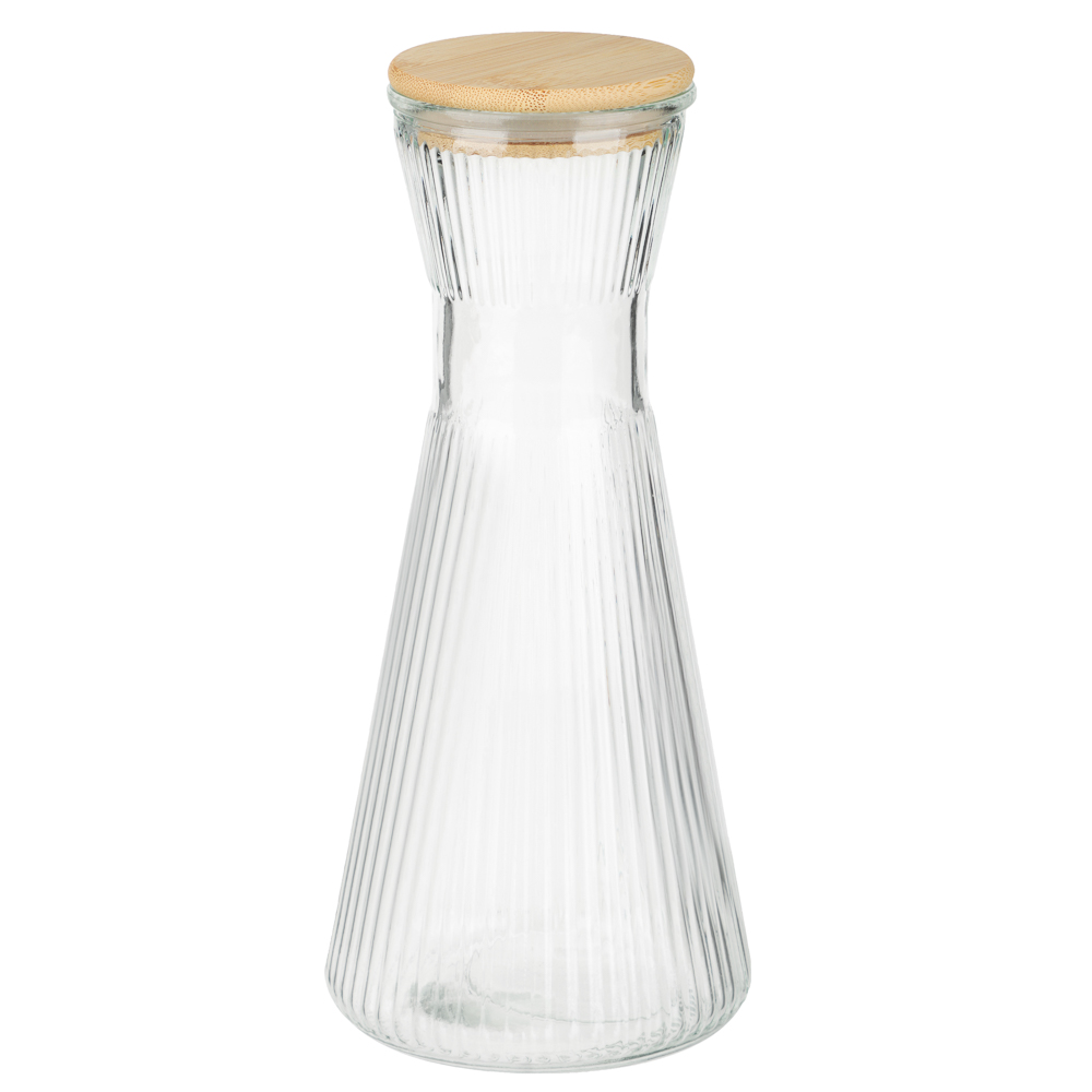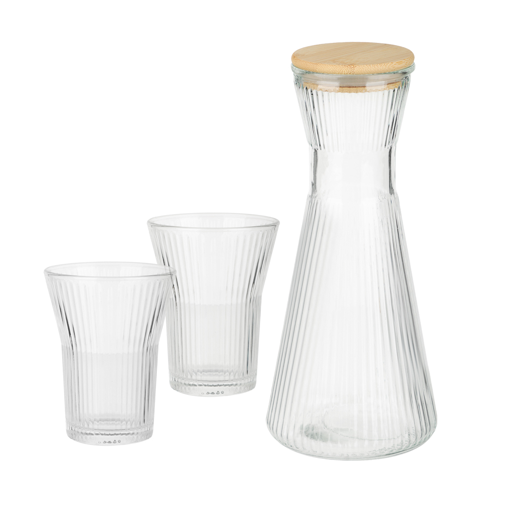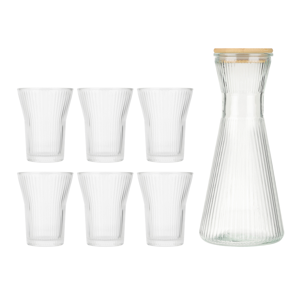 В набор входит элегантный кувшин объемом 1,8 л и шесть стаканов по 200 мл, выполненных из прочного стекла с рельефным узором, который красиво преломляет свет и подчеркивает прозрачность напитков. Кувшин оснащен крышкой из натурального бамбука, что придаёт набору современный и экологичный вид, а также сохраняет свежесть содержимого. Такой набор идеально подойдёт для подачи воды, сока, лимонада или холодного чая, создавая атмосферу уюта и стиля за любым столом.