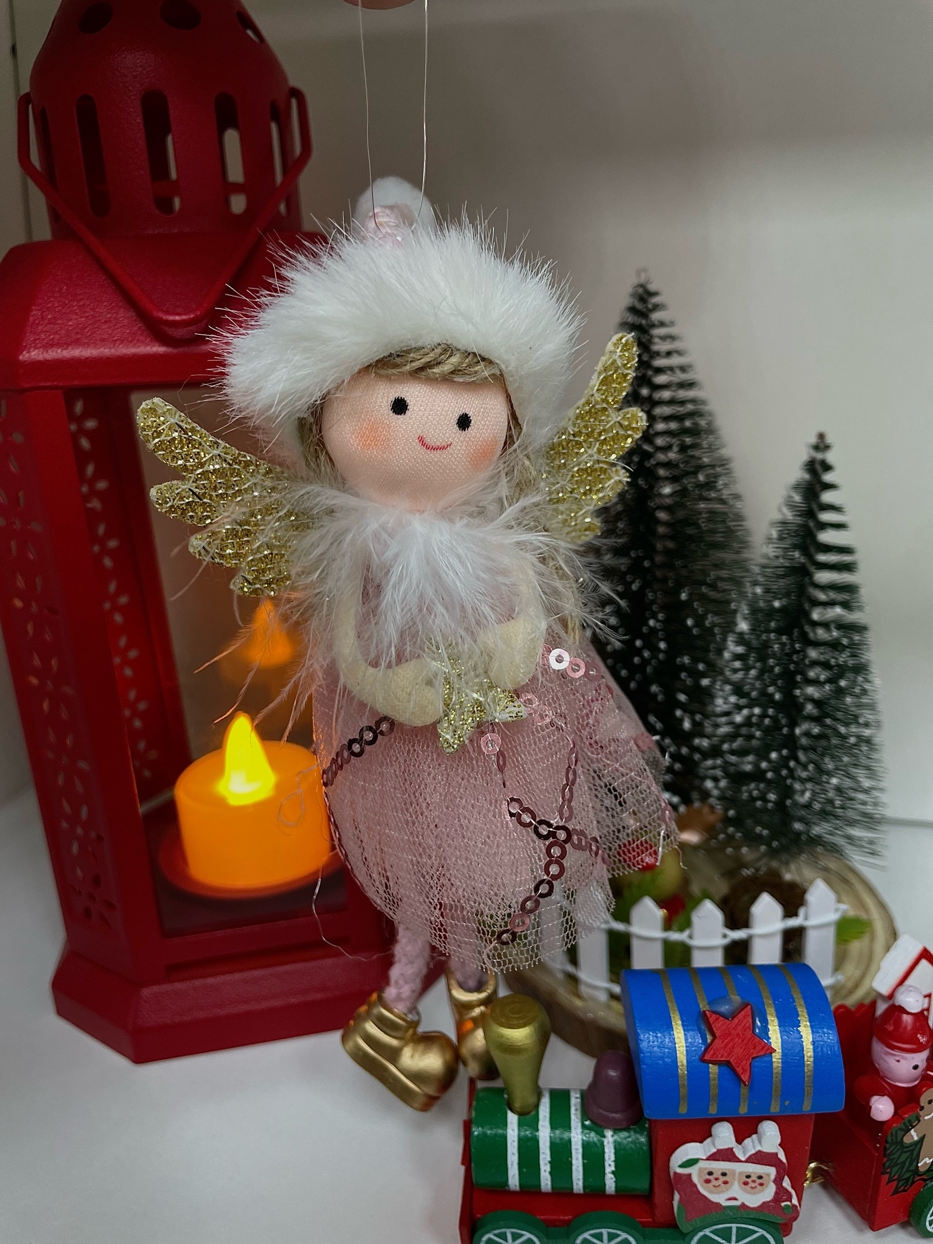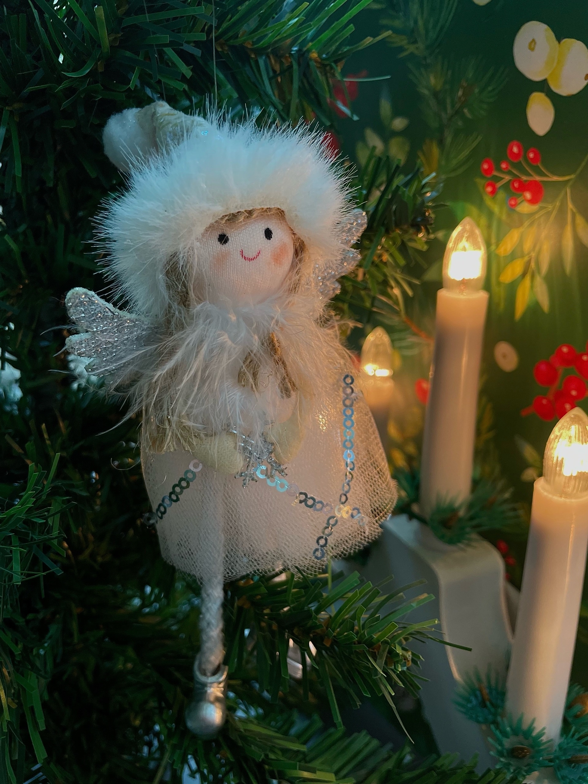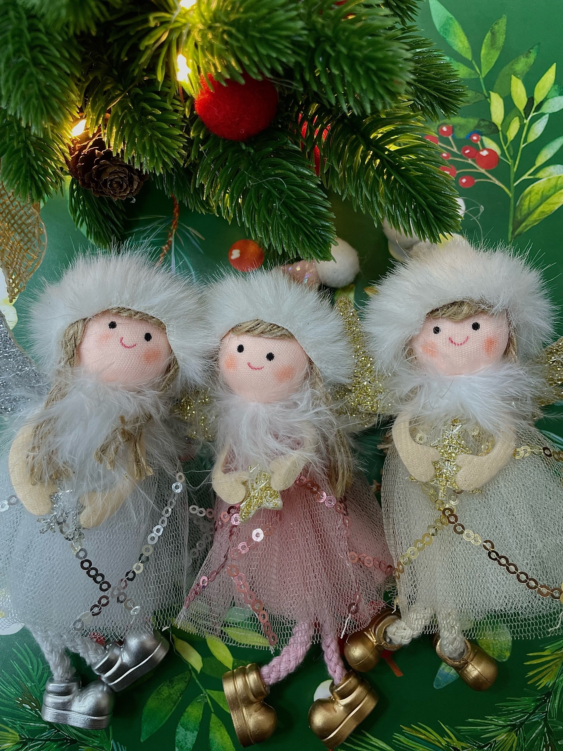 Эта очаровательная елочная игрушка в виде ангела станет прекрасным украшением для вашей новогодней елки. Ее нежная фигурка, декорированная искусственным мехом и подвеской, добавит волшебства и праздничного настроения вашему интерьеру.
