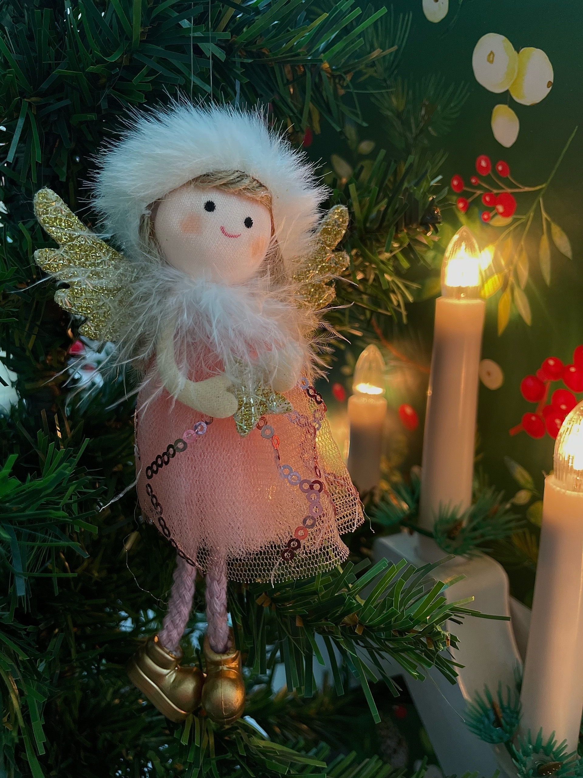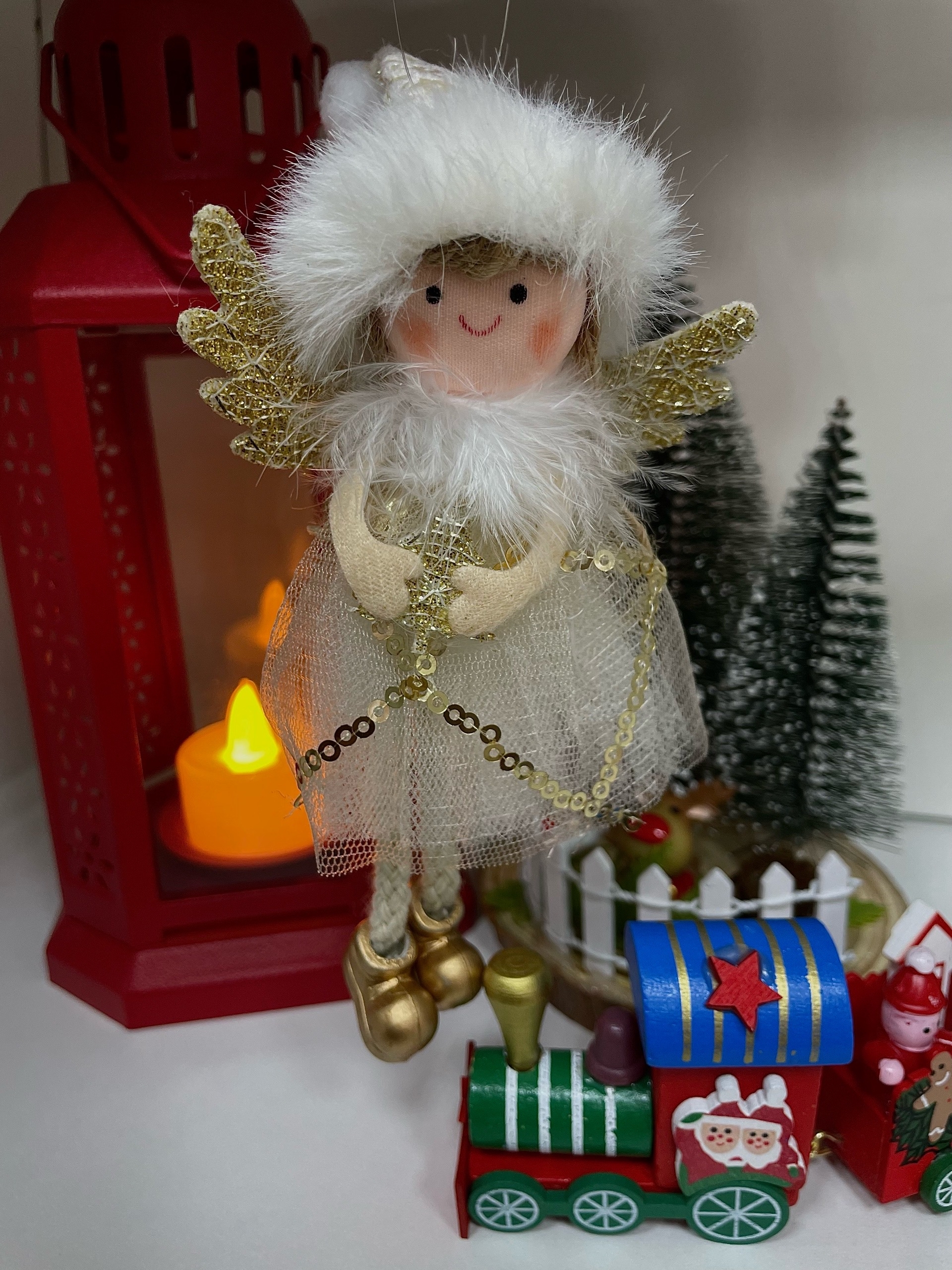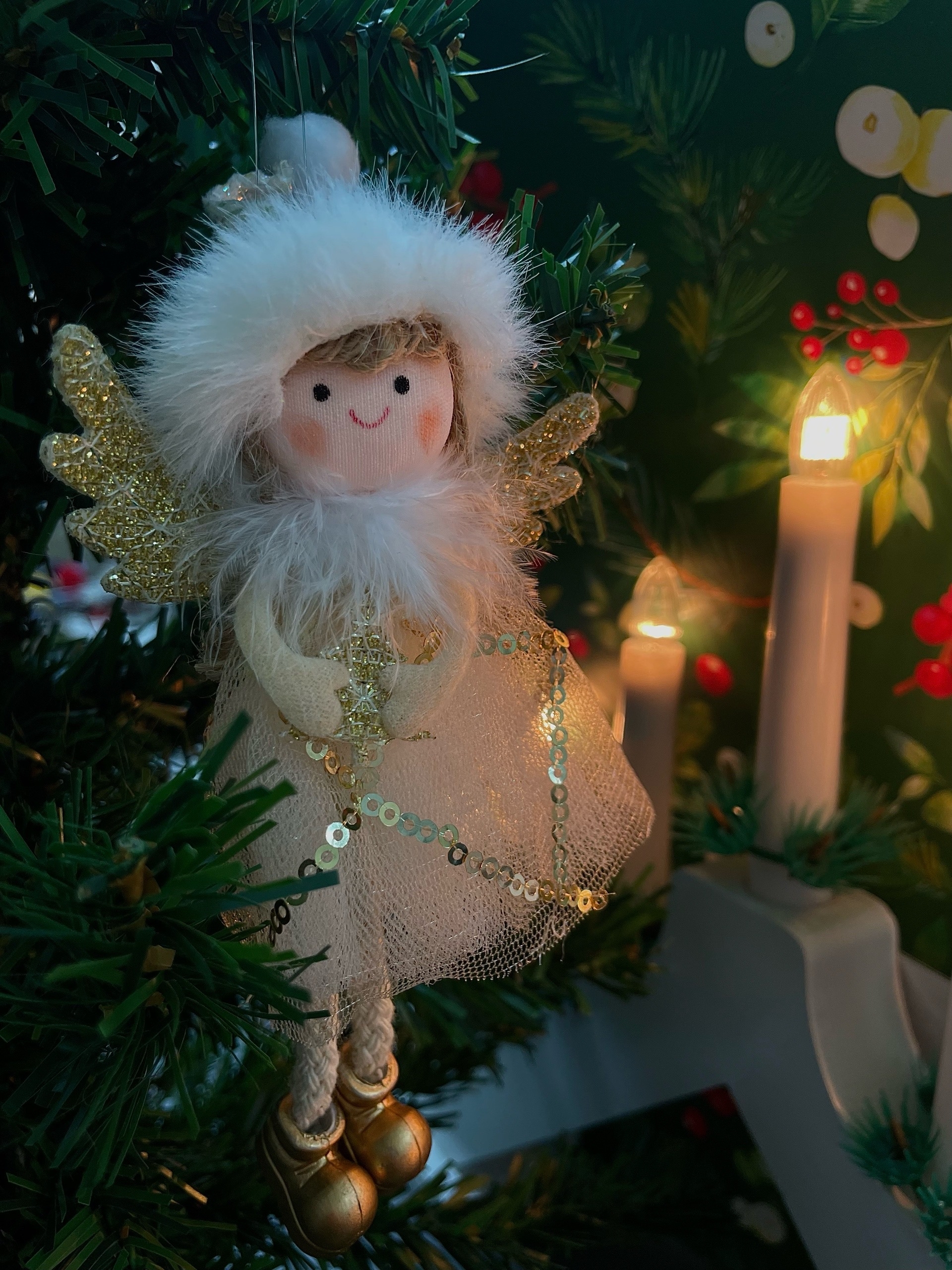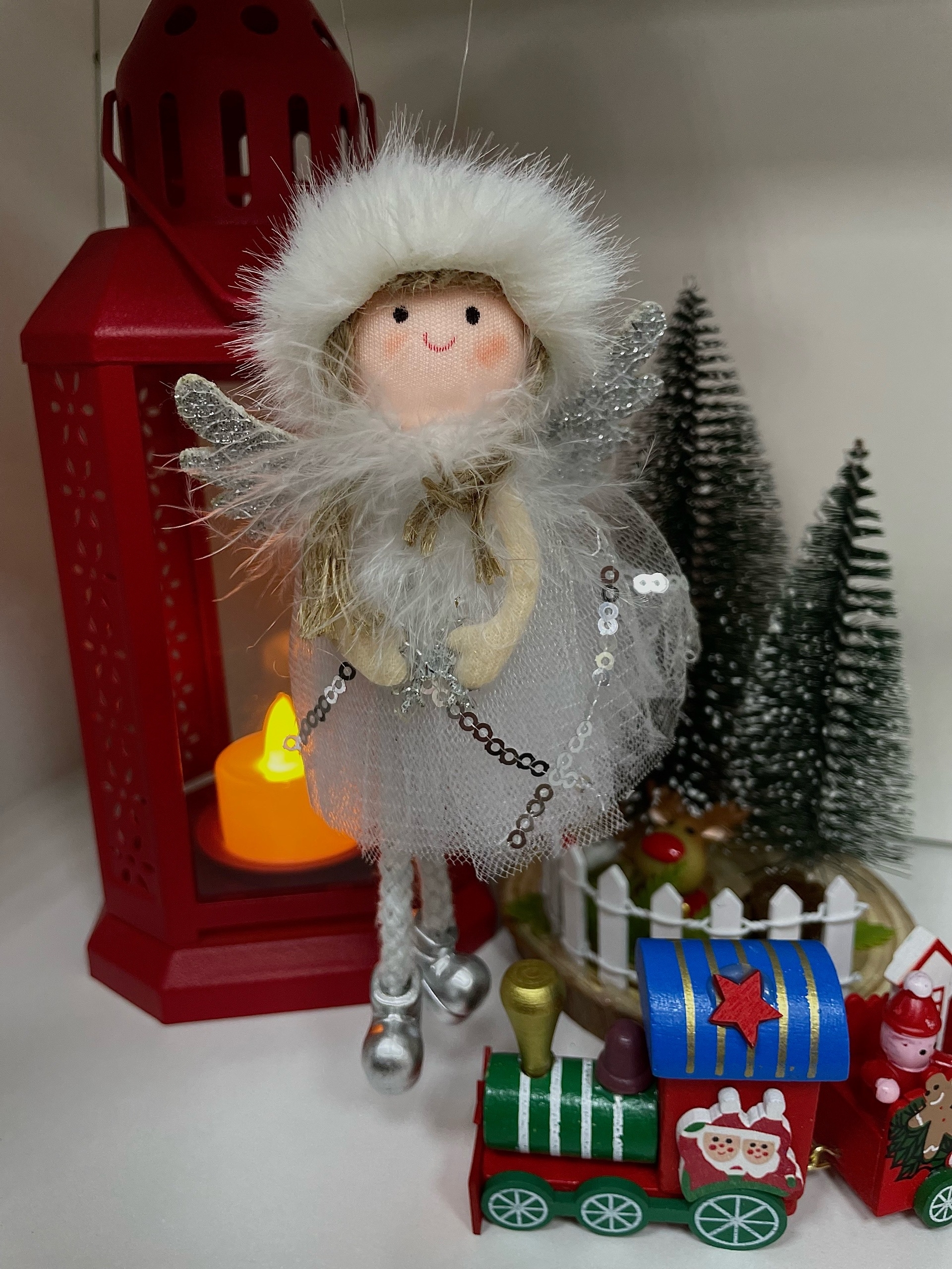 Эта очаровательная елочная игрушка в виде ангела станет прекрасным украшением для вашей новогодней елки. Ее нежная фигурка, декорированная искусственным мехом и подвеской, добавит волшебства и праздничного настроения вашему интерьеру.